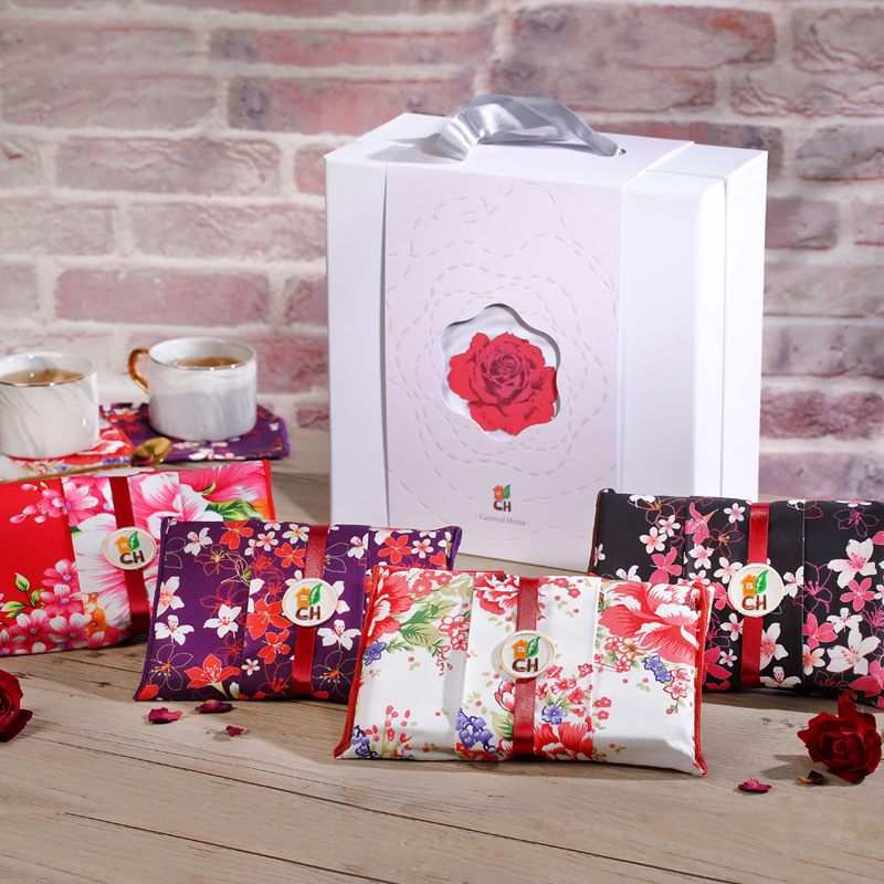 四種風呂敷包巾。 五種茶包,茗鼎金萱烏龍茶、茗鼎蜜香紅茶、歐風金萱玫瑰茶、合家歡歐風花茶、歐風蜜香玫瑰茶(隨機挑選)。 |