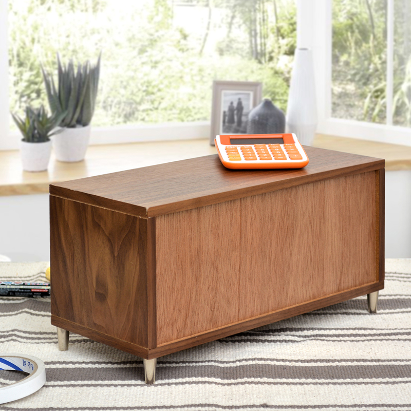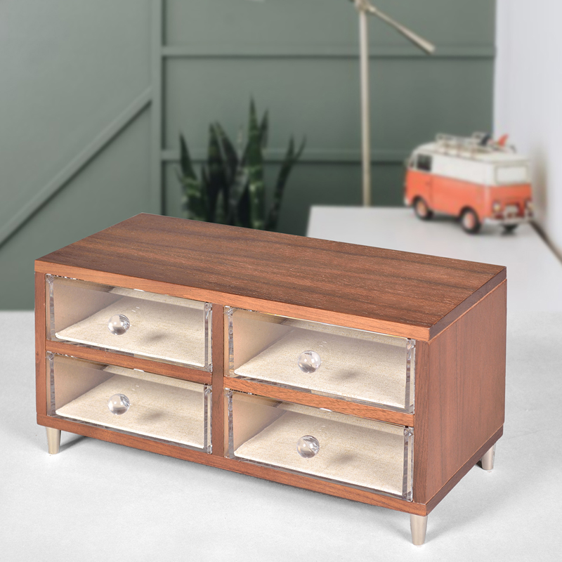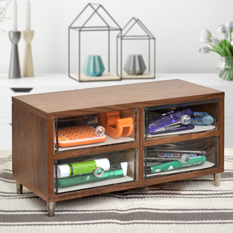 ●外層胡桃實木 / ●金屬腳座可拆卸 / ●實用簡約四抽收納盒 / ●壓克力透明抽屜,一目瞭然 / ●可收納各式小物 / ●造型輕巧,不佔空間