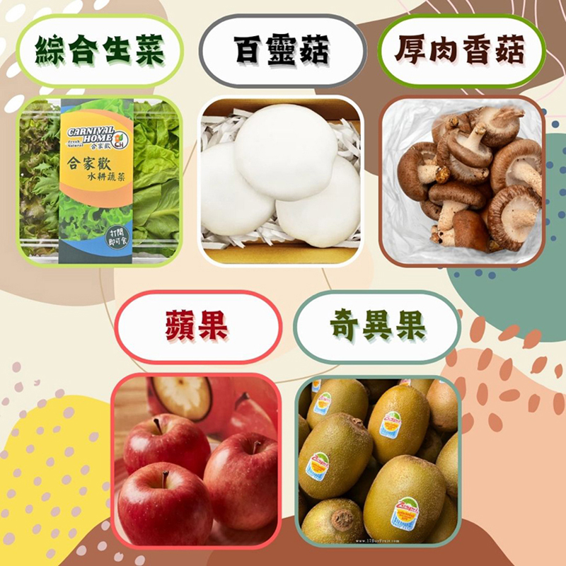 150g綜合生菜 x3盒 日本蜜富士蘋果 x3顆 紐西蘭奇異果 x3顆 |