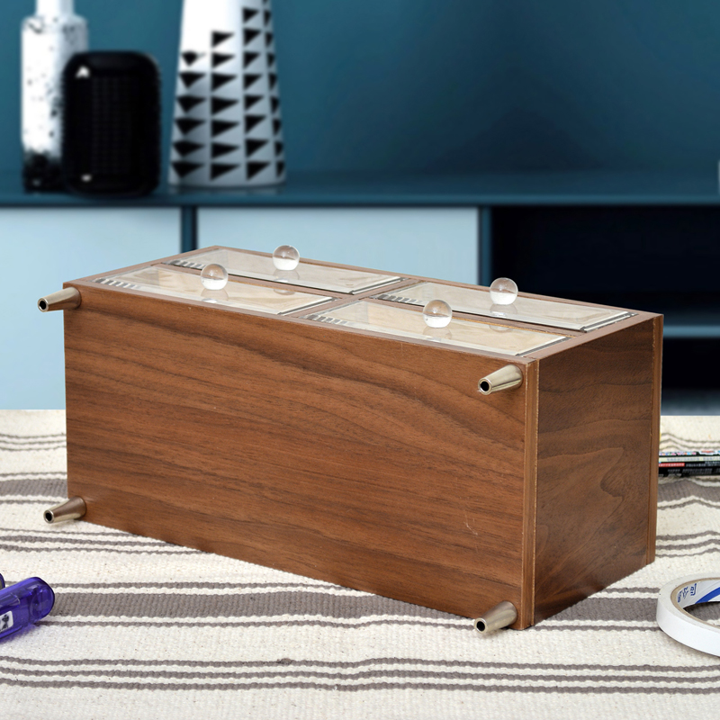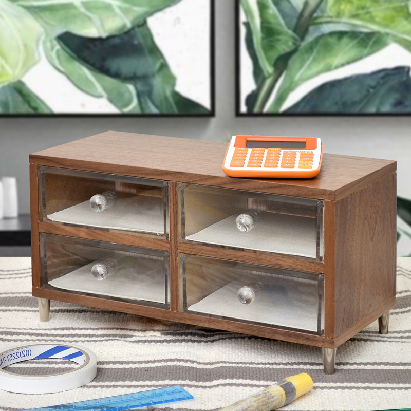 ●外層胡桃實木 / ●金屬腳座可拆卸 / ●實用簡約四抽收納盒 / ●壓克力透明抽屜,一目瞭然 / ●可收納各式小物 / ●造型輕巧,不佔空間