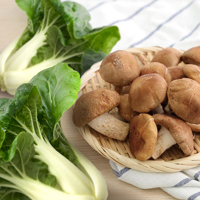 水耕牛奶白菜+有機厚肉香菇的組合。 |